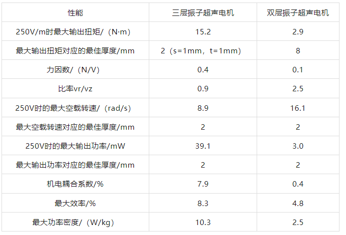 使用这种结构,可以通过改变每层的尺寸来调整刚度。通过负载特性实验测得,三层振子电机的最大输出转矩和功率分别是双层振子电机的5倍和13倍,相关数据如表3所示。